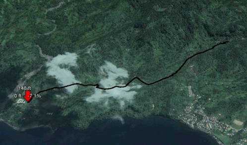 This trail is under a mile long, but one of the hardest to follow, what with all the intersections of other trails to navigate. For a real challenge, skip the trail file, take the first inland trail north of the Wallibou river, and make a LEFT at every intersection...five, I think. If it's overgrown, you might walk right past it. Roll over the picture on the right for a preview, or download the KMZ file and open in Google Earth.