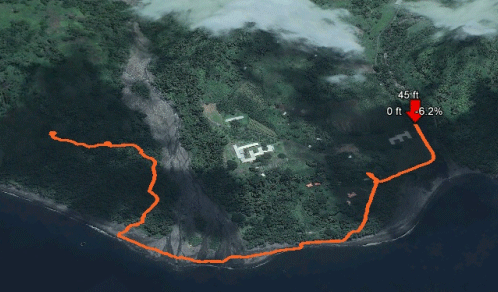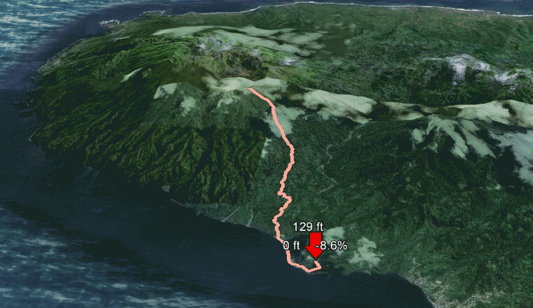 At just under five miles, this is a longer, more challenging ascent than the Windward Trail. The average slope is around 14% (most treadmills max out at 15%), and considering that the first mile of this trail is mostly downhill and along the beach, the remainder is an uphill battle. Roll over the picture on the right for a preview, or download the KMZ file and open in Google Earth.