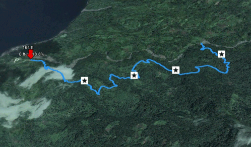 The Trinity Falls trail is half road, half trail, but pretty simple to follow. Be very careful crossing the boards covering the streams (5 or 6), and VERY careful on the staircases. Some of the steeper sections of the road are slick as ice when even damp, so be careful there, as well. This trail file dumps you out just upstream of the actual falls. Roll over the picture on the right for a preview, or download the KMZ file and open in Google Earth.